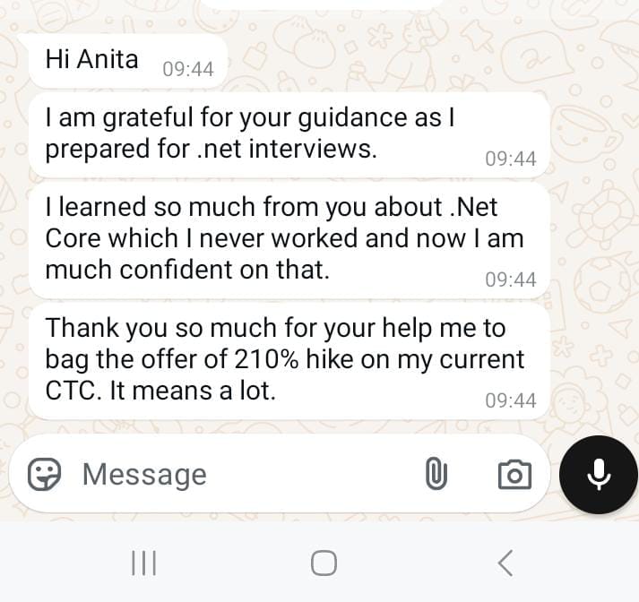 Meet Anita, an IT Programming Coach And Founder DotNet Interview Mastery having 12+ years of experience in some of the Leading IT industries with a sound salary in BFS domain.
